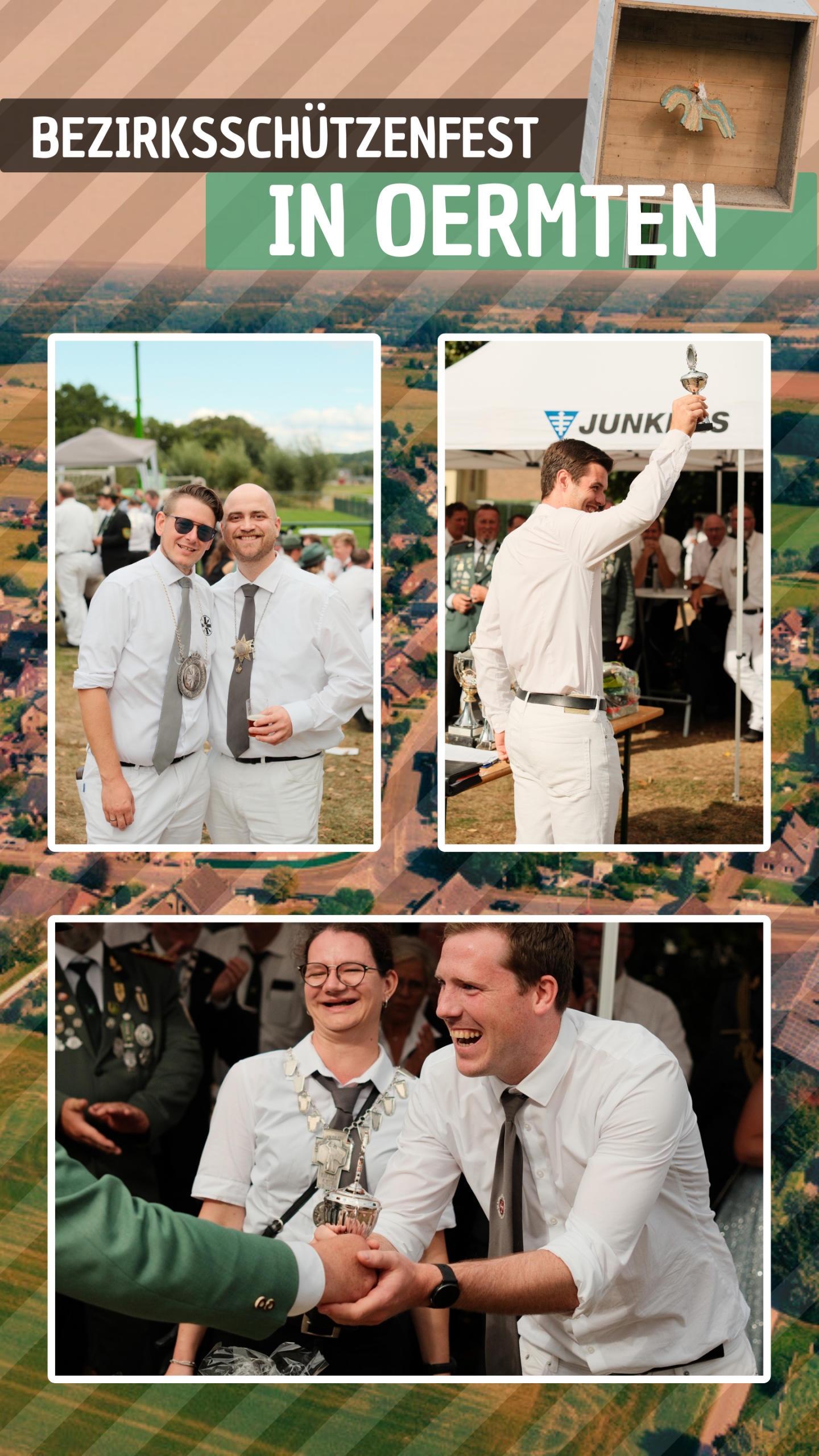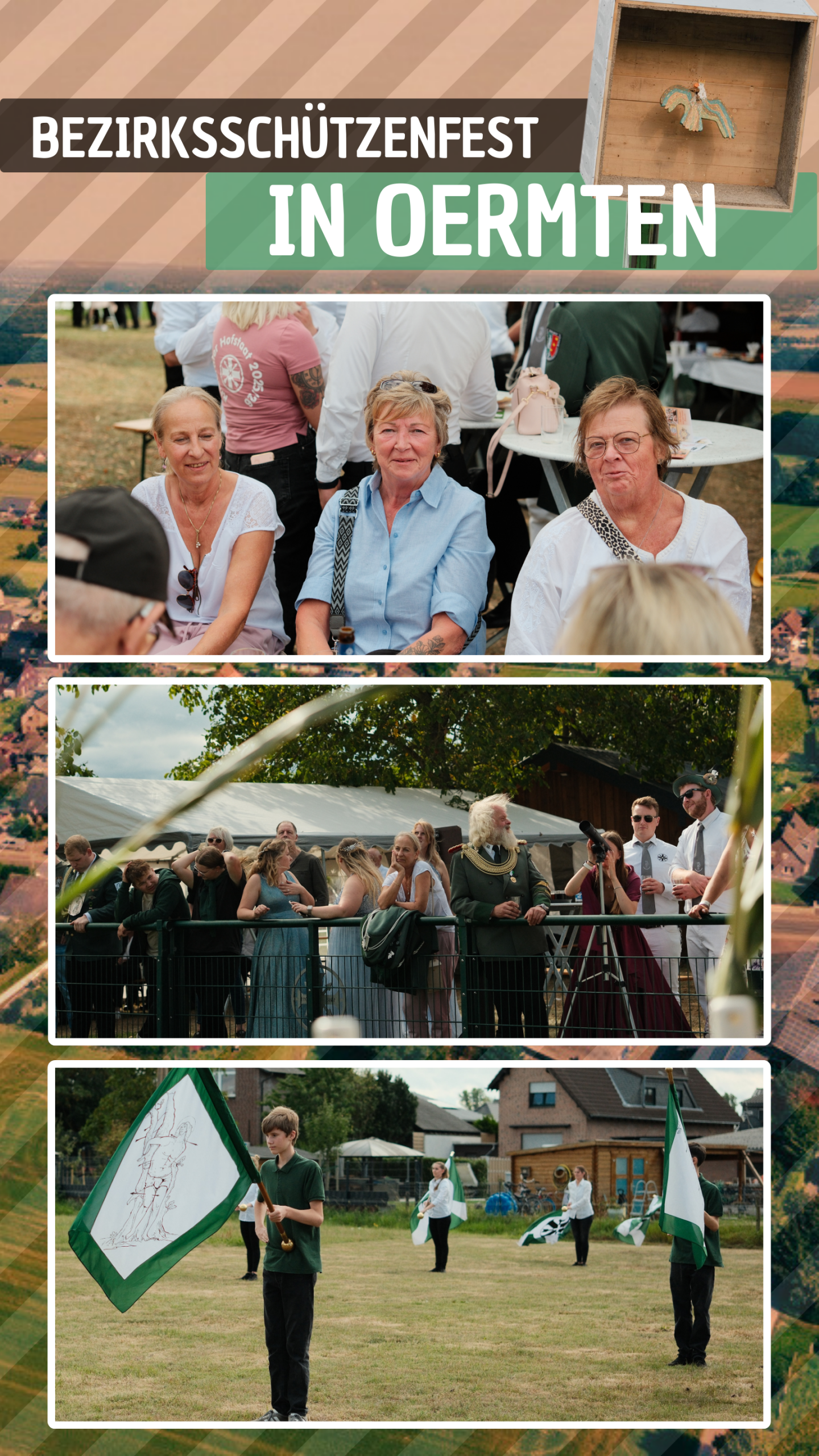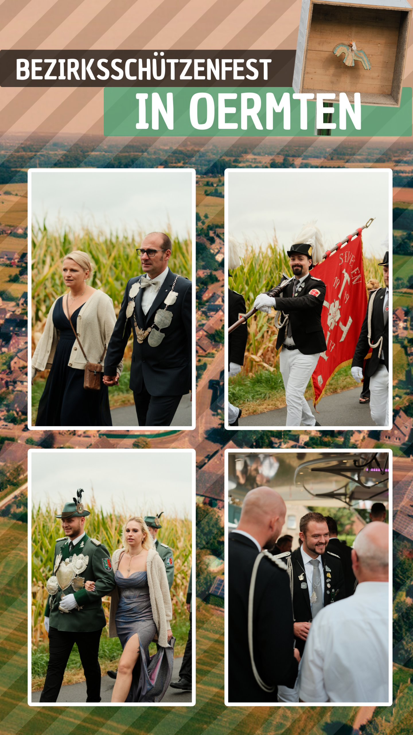 Im Anschluss formierten sich die Bruderschaften am MehrGenerationenPlatz in Oermten zum großen Umzug mit rund 250 Teilnehmern. Auf der Heide wurde der Marsch kurz unterbrochen, um das beeindruckende Schaufahnenschwenken abzuhalten – fast 30 Schwenker sorgten für ein starkes Bild, das mit viel Applaus belohnt wurde. Danach ging es zurück zum Festplatz, wo die Gäste Zeit hatten, das Gelände zu erkunden, bei kühlen Getränken und gutem Essen ins Gespräch zu kommen.
